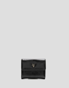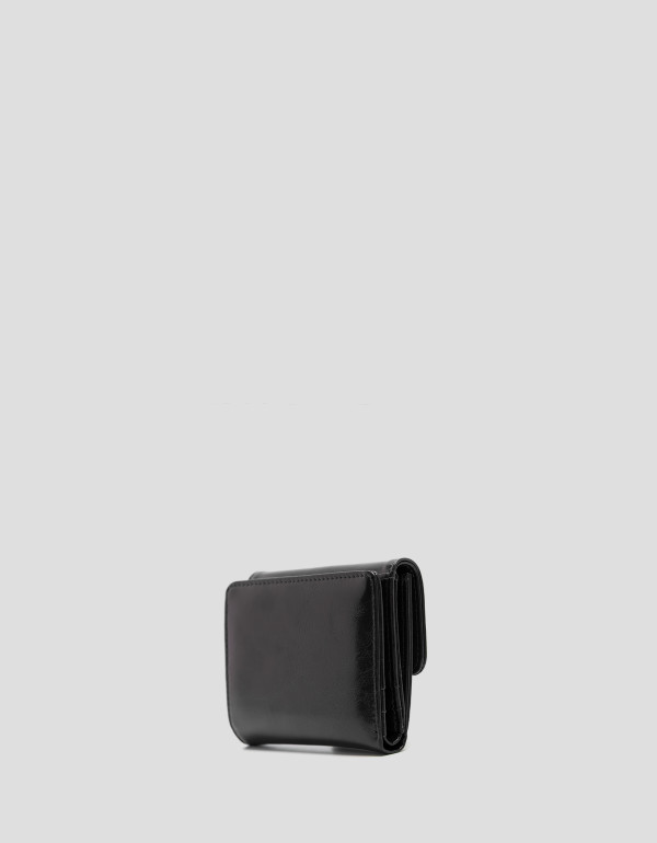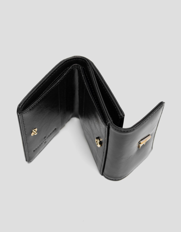 Cartera en piel craquelada color negro con monedero cerrado con broche bajo solapa e interior forrado y compartimentado para tarjetas, cerrado con broche. Personalizado con RV metálica. Metálicas en oro claro. Medidas aproximadas: 19 x 9 x 1 cm.