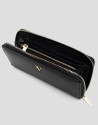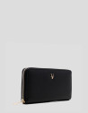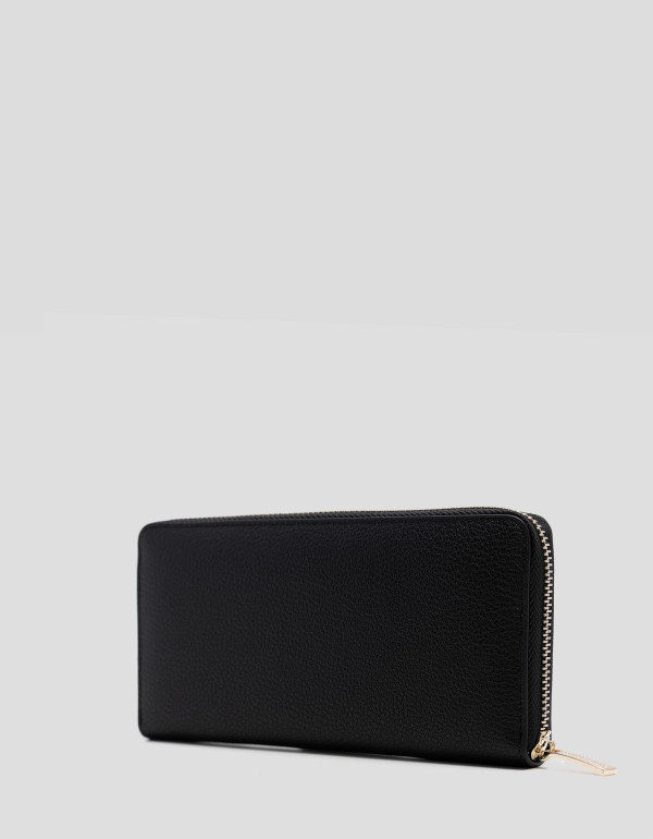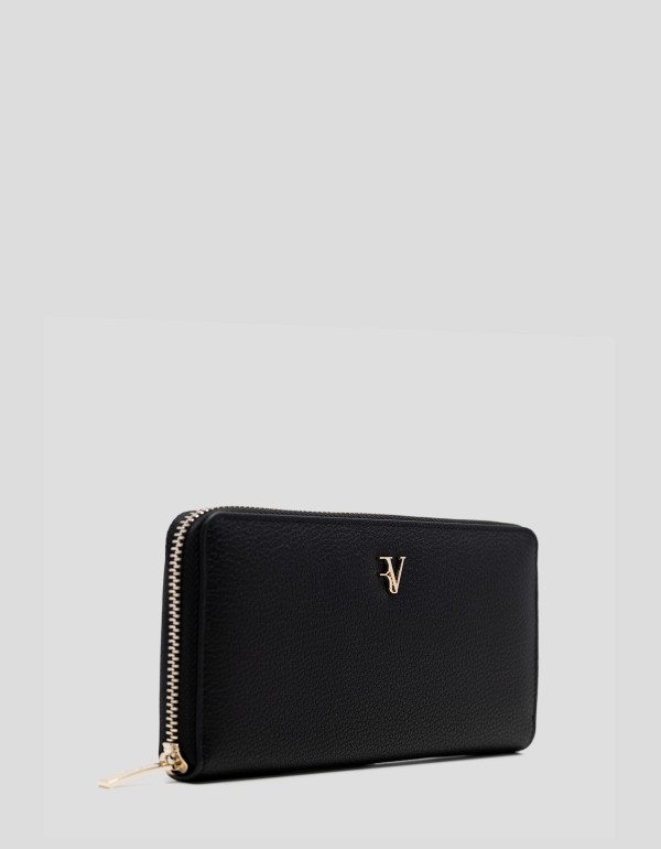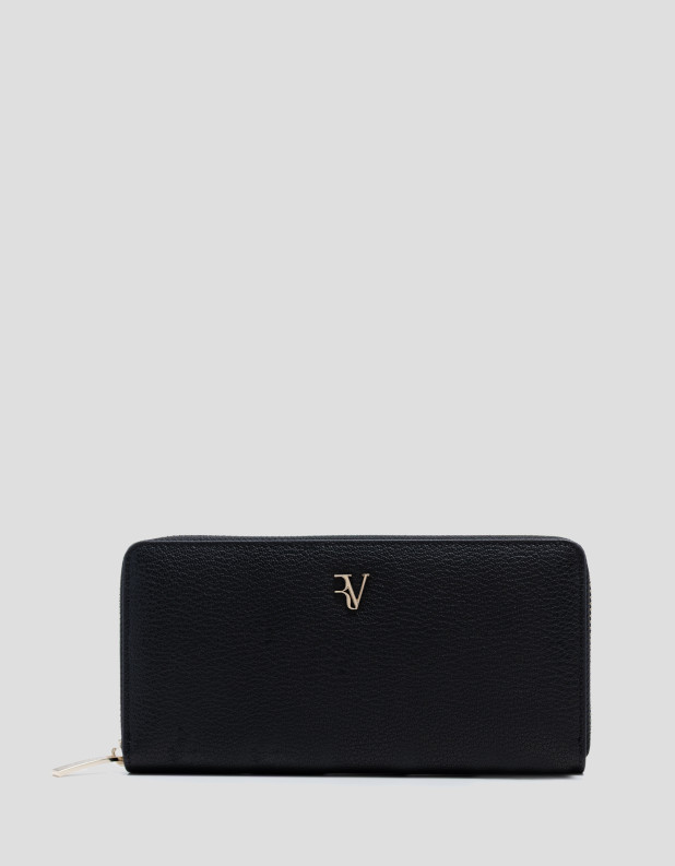 Cartera grande en piel granulada color negro con RV metálica en panel frontal. Cierre con cremallera, interior forrado y compartimentado con tarjetero, billetero y monedero cerrado con cremallera. Metálicas en oro claro. Medidas aproximadas: 19 x 11 x 2,5 cm