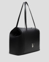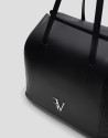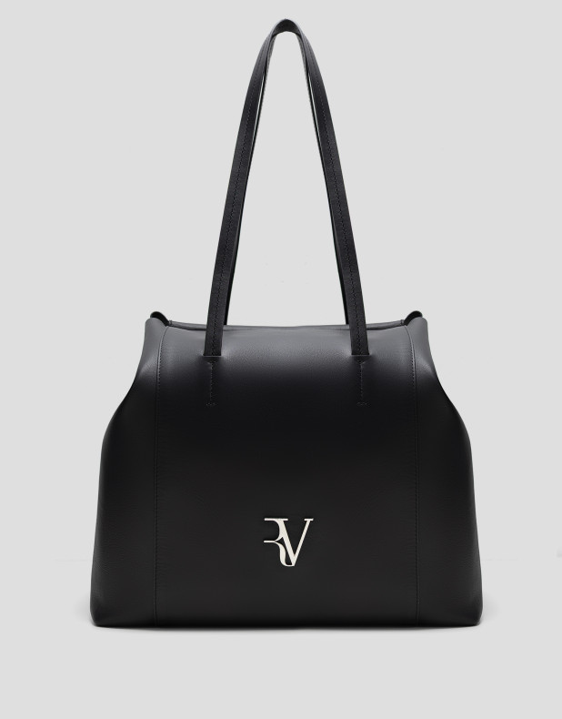 Bolso de hombro estilo shopper en piel color negro con cierre de cremallera y logo RV metálico en panel delantero. Interior forrado y compartimentado con bolsillo plano de piel y cremallera. Metálicas en oro claro. Altura asa: 44 cm. Medidas aproximadas: 35 x 35 x 13 cm.