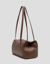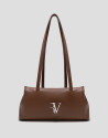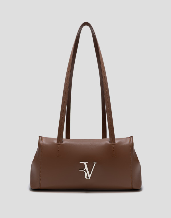Bolso de hombro en piel color marrón claro con pespuntes a tono y logo RV metálico en panel delantero. Cierre con cremallera larga para facilitar apertura y con tira de piel con clips. Interior sin forrar y con bolsillos abiertos planos de piel de 25 x 16 cm. Asa de hombro de 33 cm de altura. Metálicas en oro claro. Medidas aproximadas bolso: 30 x 15 x 13 cm.