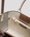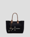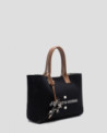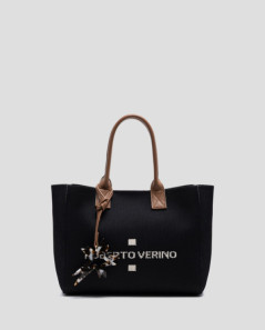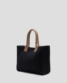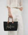 Bolso de mano en punto color negro con panel frontal personalizado con jacquard a contraste de logo Roberto Verino. Asas con doble pespunte cruzado y charm de estrella. Cierre de imán e interior con bolsillo de cremallera. Asa de hombro en piel de 14 cm de altura. Metálicas en oro claro. Medidas aproximadas bolso: 28,5 x 27 x 7,5 cm.