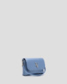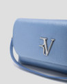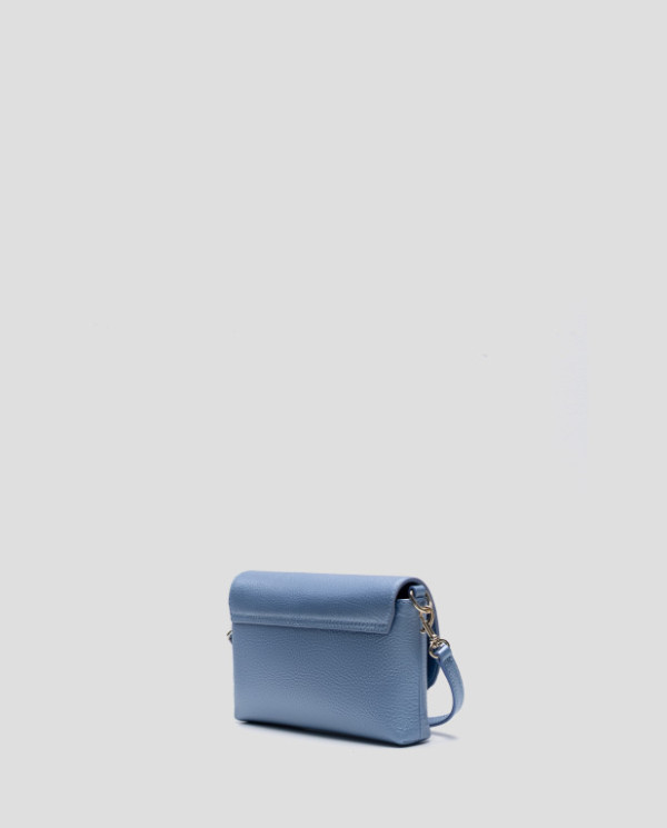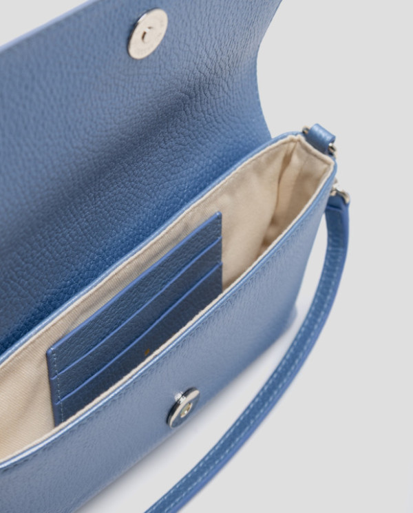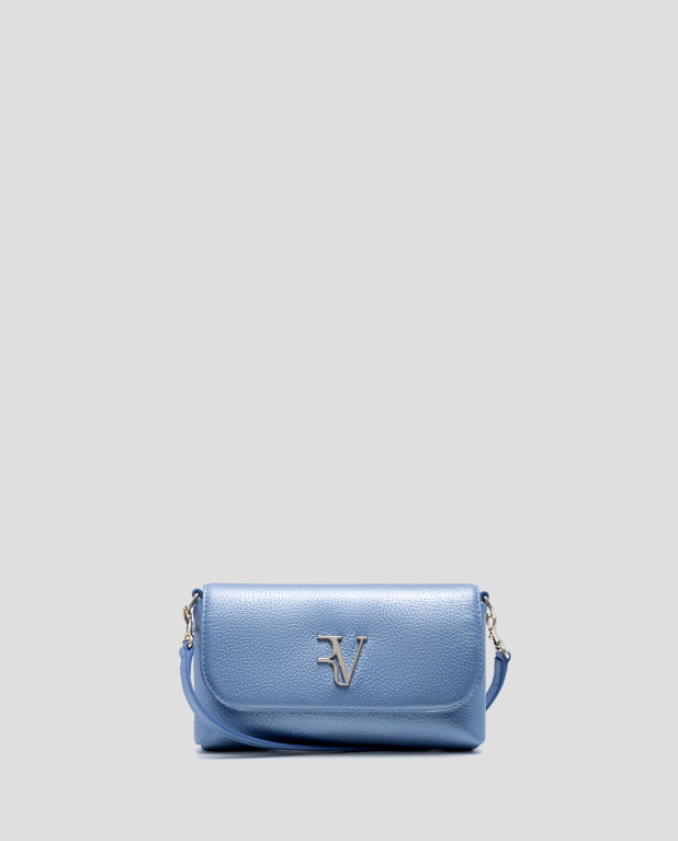Mini bolso de mano en piel granulada metalizada color azul con asa de mano y asa bandolera extraíbles. Solapa con logo RV metálico, cierre con clip e interior forrado y compartimentado con bolsillo tarjetero. Metálicas en oro claro. Asa de mano de 1cm de ancho y altura de 17 cm y asa bandolera de 1 cm de ancho y 119 cm de largo. Medidas aproximadas: 20 x 11 x 3 cm.