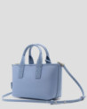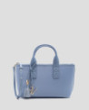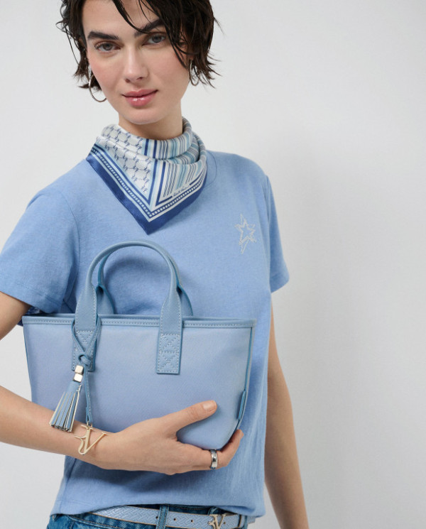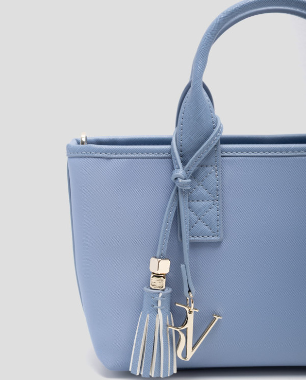 Bolso de mano pequeño en nailon color azul claro con vivo a tono. Asas de mano con doble pespunte cruzado y charm personalizado con RV metálica, borla y cubos. Cierre con cremallera, interior forrado y compartimentado con bolsillo de cremallera y bolsillo abierto plano. Metálicas en oro claro. Altura asa de mano: 10 cm. Medidas aproximadas: 25 x 16 x 9 cm