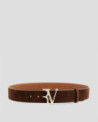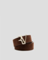 Cinturón en piel serraje color marrón con forro grabado personalizado. Hebilla RV en metálica oro claro con trabilla en piel. Ancho: 4 cm