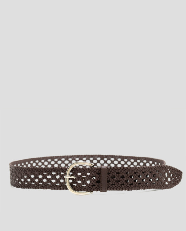 Cinturón en piel trenzada a mano con acabado calado color marrón. Hebilla redondeada en oro claro personalizada con logo. Ancho: 4 cm
