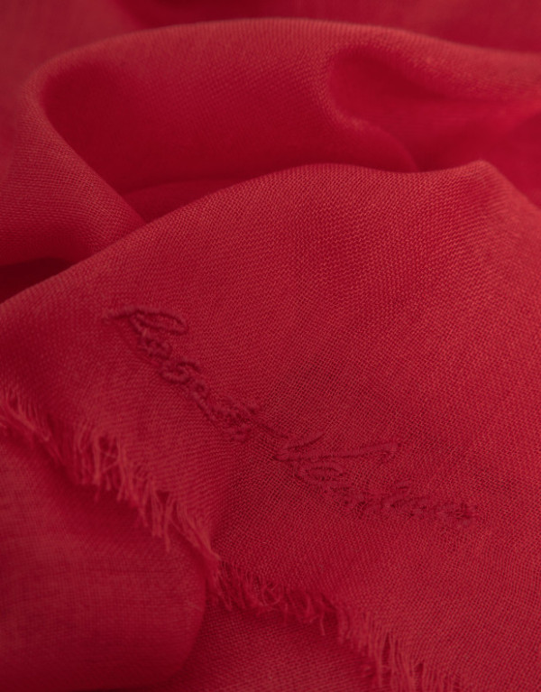 Fular en modal color rojo con firma bordada a tono y remates desflecados. Medidas: 110 x 190 cm.