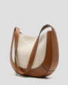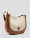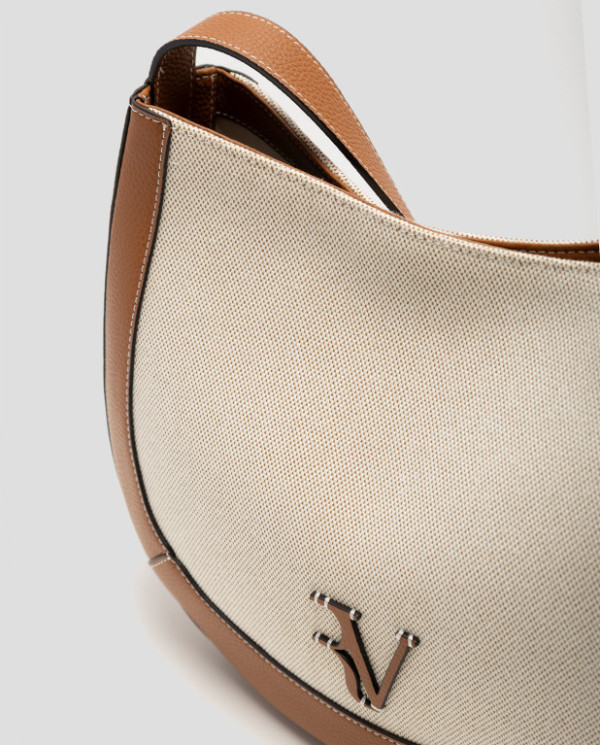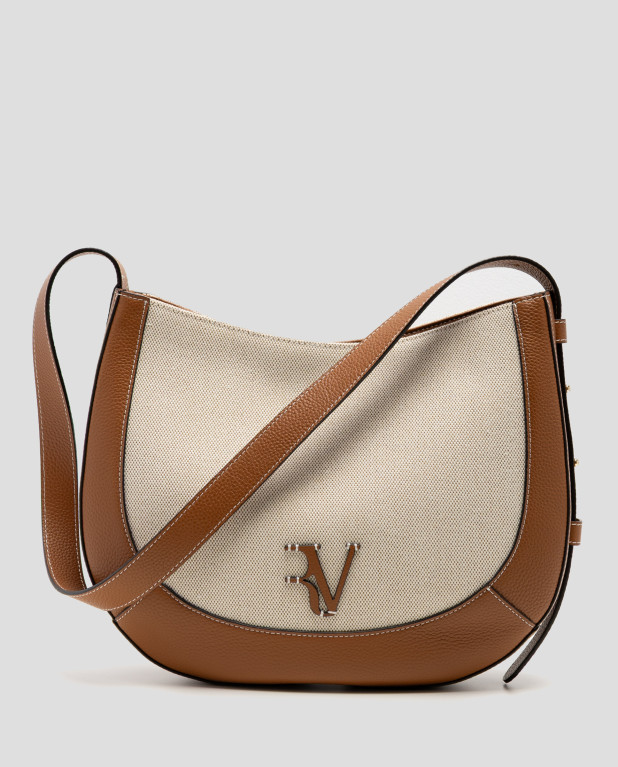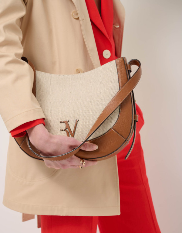 Bolso de hombro en lona color beige combinado con piel color cámel en base, asas y logo RV en panel frontal. Cierre con imán e interior forrado y compartimentado con bolsillo plano en piel. Asa de hombro de 30 cm de altura y asa bandolera regulable de 113 a 130 cm. Metálicas en oro claro. Medidas aproximadas bolso: 31 x 27 x 7,5 cm.