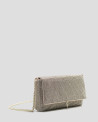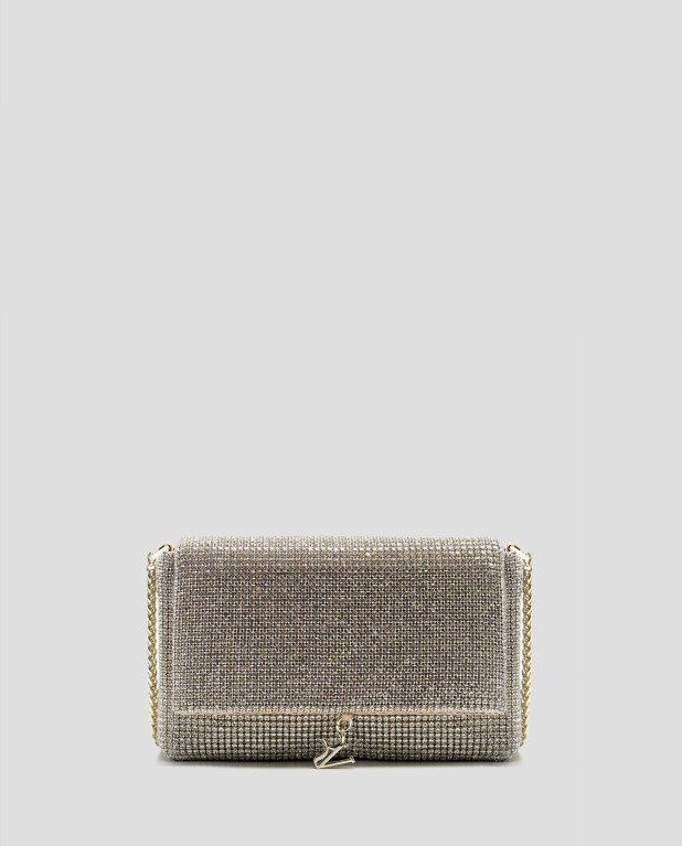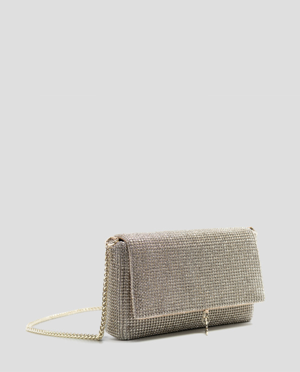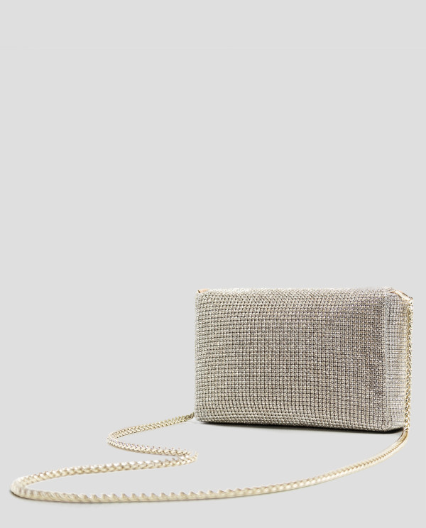 Bolso bandolera confeccionado en malla metálica de cristales incrustados en color dorado con RV metálica colgante en solapa. Cierre con clip, interior forrado y compartimentado con bolsillo plano. Asa bandolera de cadena metálica con doble posición: asa de hombro y asa bandolera. Metálicas en oro claro. Medidas aproximadas bolso: 19 x 11 x 5,5 cm.