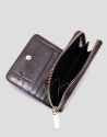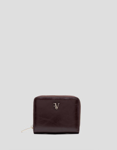 Cartera en piel craquelada color burdeos con pespuntes a tono y cierre de cremallera y logo metálico en panel frontal. Interior forrado y compartimentado con tarjetero, billetero y monedero de dos cuerpos. Metálicas en oro claro. Medidas aproximadas: 11 x 10 x 3 cm