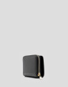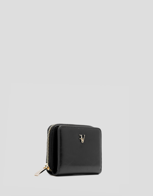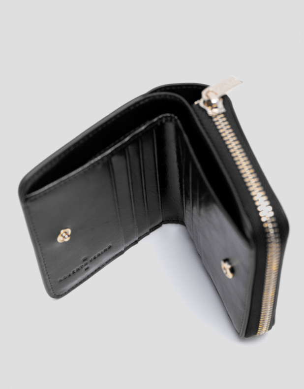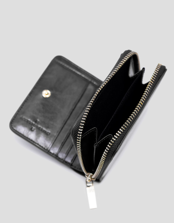 Cartera en piel craquelada color negro con pespuntes a tono y cierre de cremallera y logo metálico en panel frontal. Interior forrado y compartimentado con tarjetero, billetero y monedero de dos cuerpos. Metálicas en oro claro. Medidas aproximadas: 11 x 10 x 3 cm