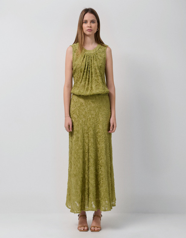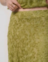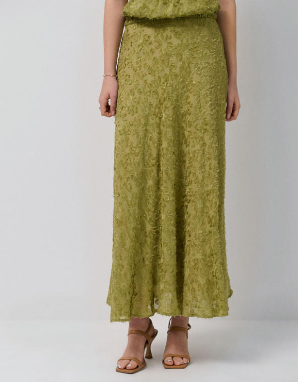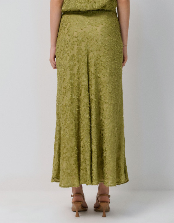 Falda midi en un tejido fill coupé con diseño floral color verde musgo. Cierre con cremallera oculta en lateral.