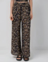 Pantalón palazzo en un crepé con base color negro y estampado de hojas en tonos marrones, ocres y beiges. Dos bolsillos laterales y cintura con goma.