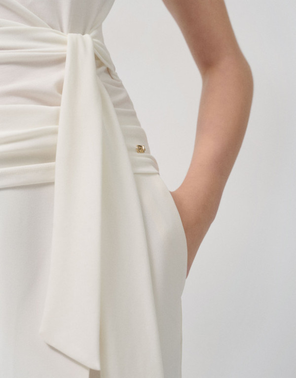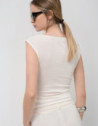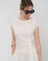Camiseta sin mangas en un tejido fluido color crudo. Escote drapeado y cintura fruncida con lazo.