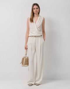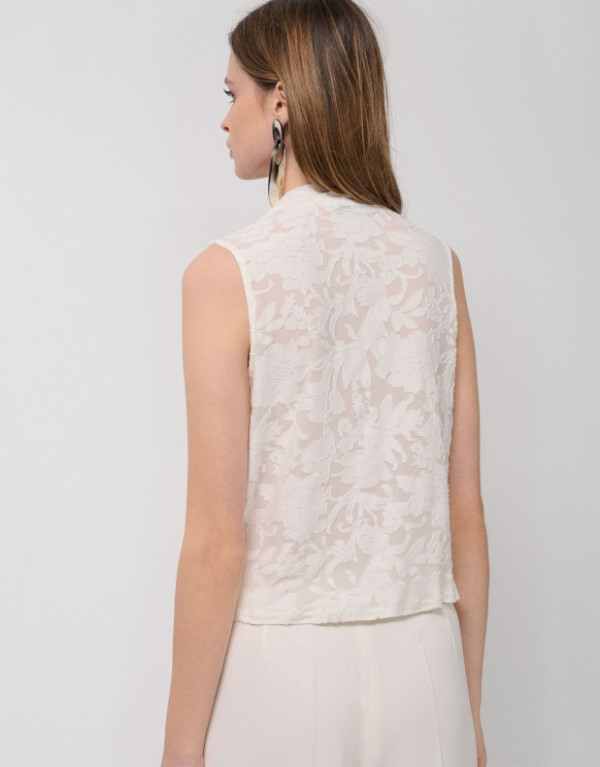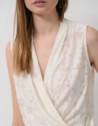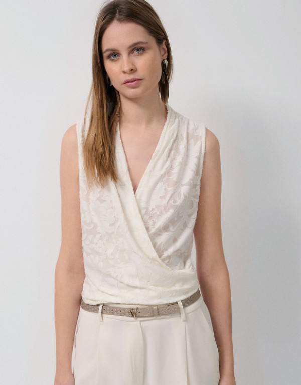 Camiseta sin mangas en un tejido ligeramente elástico color blanco con escote pico, fruncido en cadera y hombros y cuerpo cruzado.