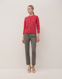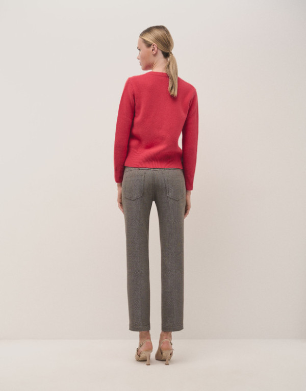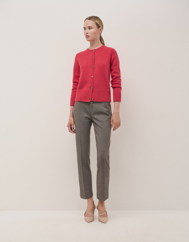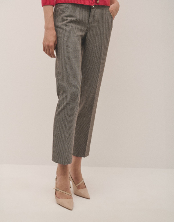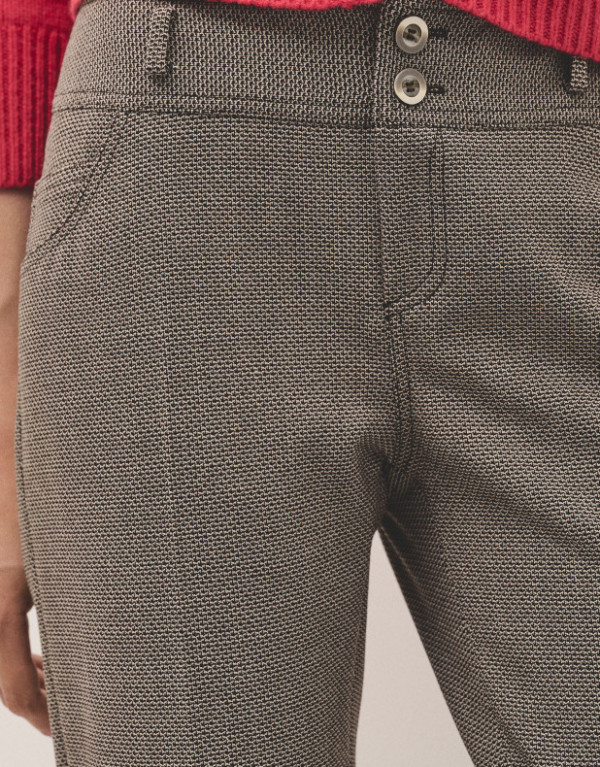 Pantalón de cinturilla ancha en un tejido con fantasía de jacquard en tonos marrones y negros. Cierre con doble botonadura vertical con presillas, bolsillos vaqueros con bolsillo monedero, pretina, raya de planchado y bolsillos traseros clásicos de plastrón.