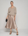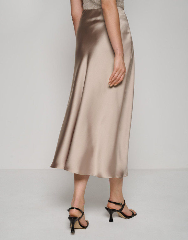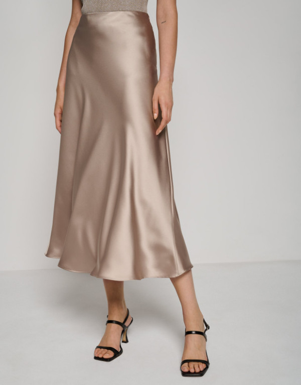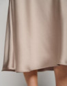 Falda midi con ligero evasé en satén color visón. Cierre con cremallera invisible en costado
