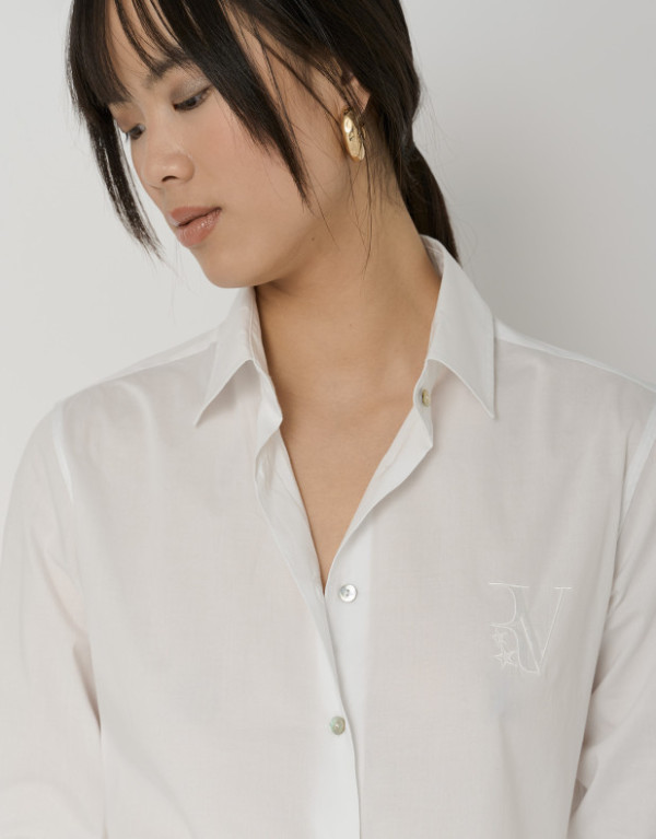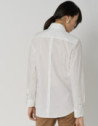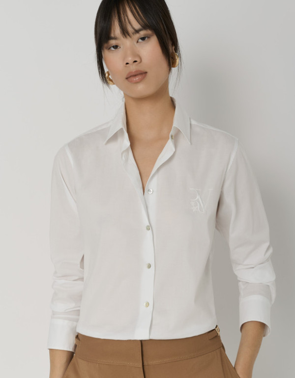 Camisa de manga larga en algodón blanco con bordado RV a tono en pecho. Cuello camisero, corte recto y espalda con canesú y pliegue y cierre con botonadura a la vista.