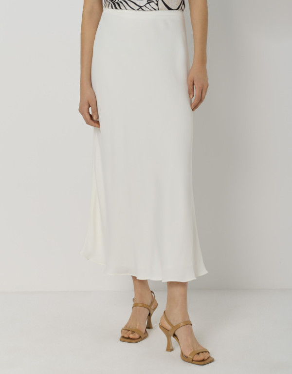 Falda midi con evasé en un tejido ligero color crudo. Cierre con cremallera invisible en costado