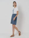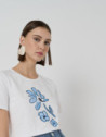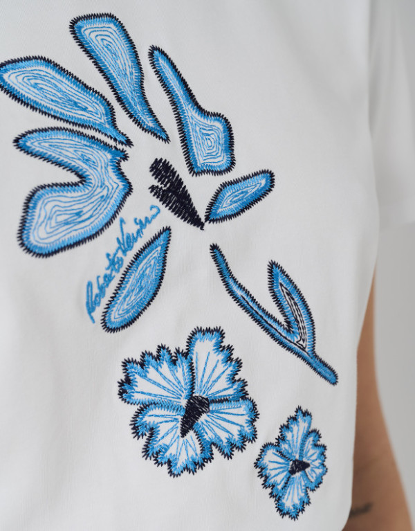 Camiseta de manga corta en un algodón blanco con flor bordada en tonos azules en delantero. Escote redondo y corte recto.