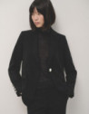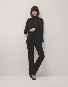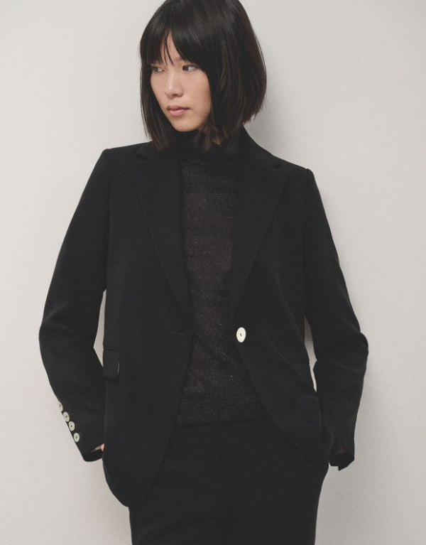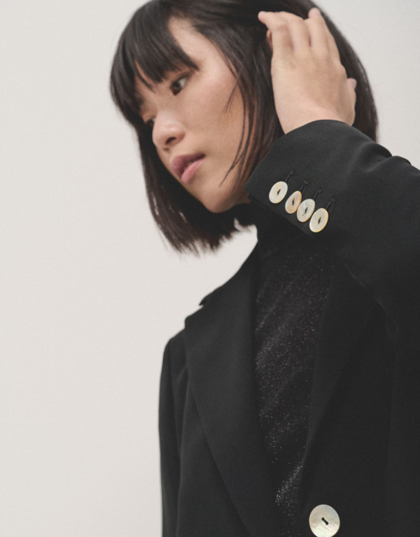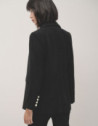 Blazer larga en crepé negro con cierre de un botón y forro a tono. Cuello solapa, manga rematada con botones y bolsillos de tapeta en delantero.
