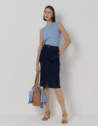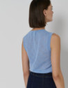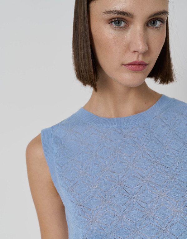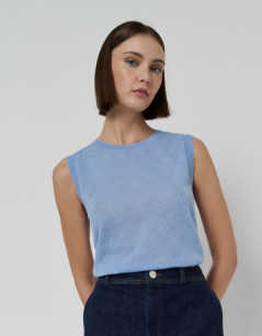 Top sin mangas en un punto fino con mezcla de lino color azul claro con dibujo geométrico. Escote redondo y remate de la prenda en canalé. Este top completa un twin set con una chaqueta.