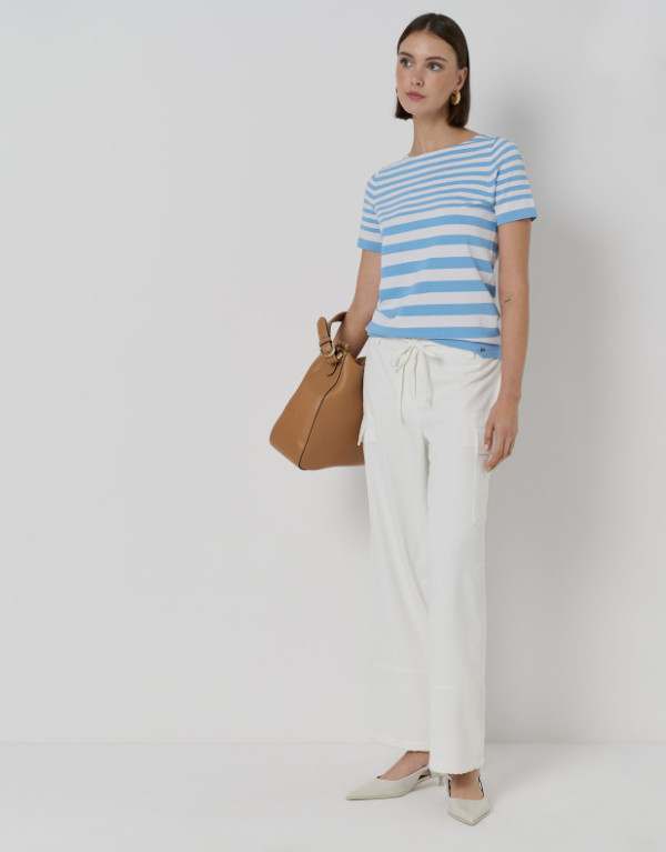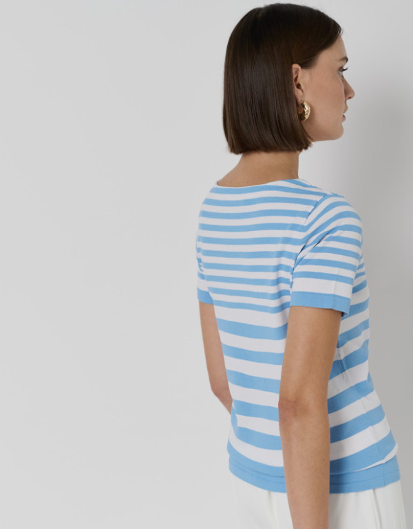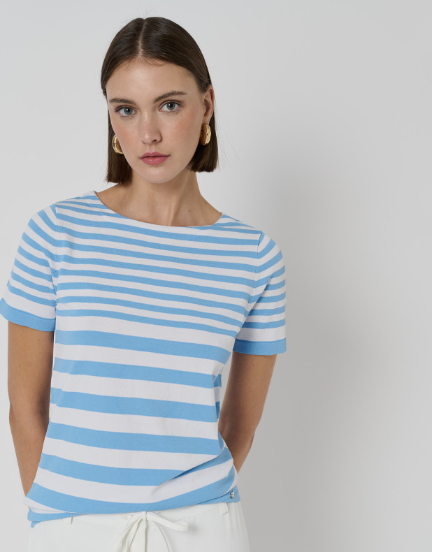 Jersey de manga corta y escote barco en punto fino y ligero a rayas horizontales azules y blancos.