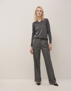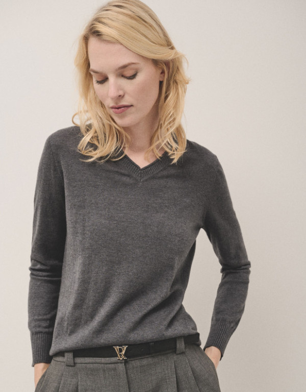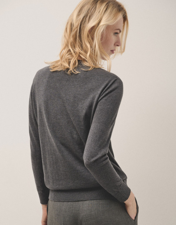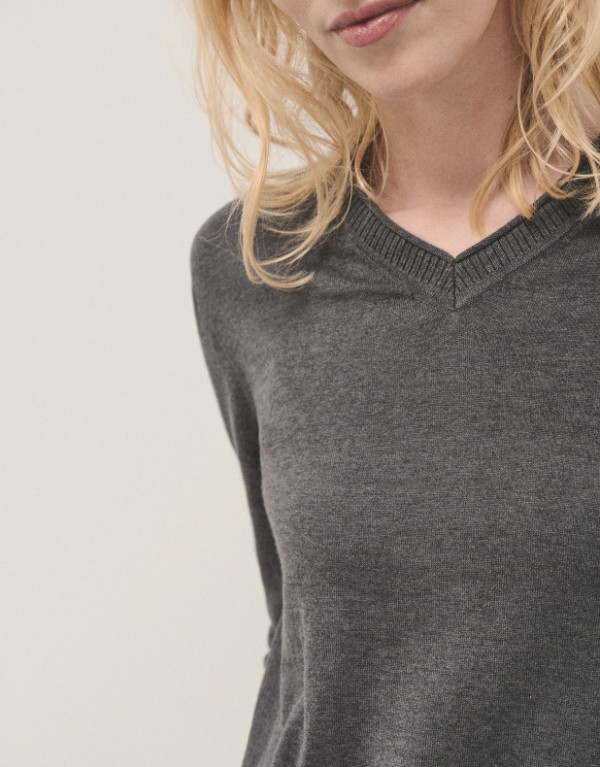 Jersey con escote pico en un punto fino mezcla de algodón, lana y seda color gris oscuro con remate de canalé ancho en puños, bajo y escote.