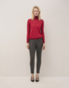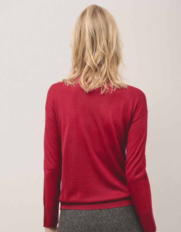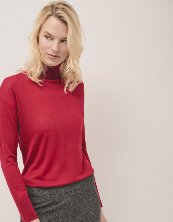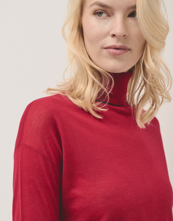 Jersey de manga larga y cuello cisne en un punto fino de lana color rojo. Remate con canalé estrecho.