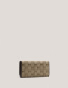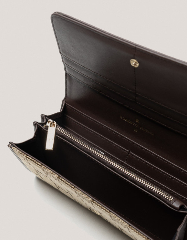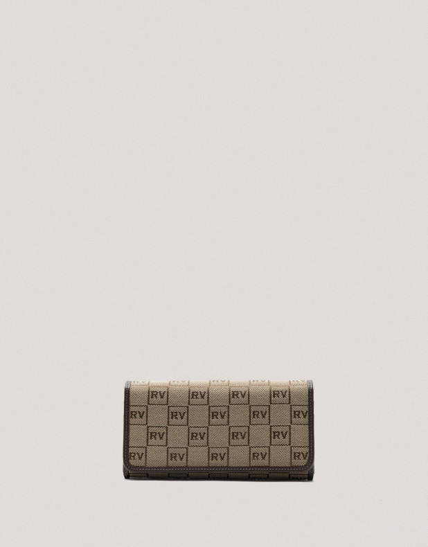 Cartera billetera grande en tejido jacquard personalizado RV en tonalidades marrones. Tapeta frontal con logo RV metálico, cierre con broche y ranuras para tarjetas y billetes. Bolsillo exterior de cremallera en panel trasero. Cuerpo interior con bolsillo central de cremallera, bolsillo con ranuras y bolsillo abierto. Acabados metálicos en color plata. Medidas aproximadas: 19 x 10 x 3 cm