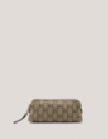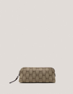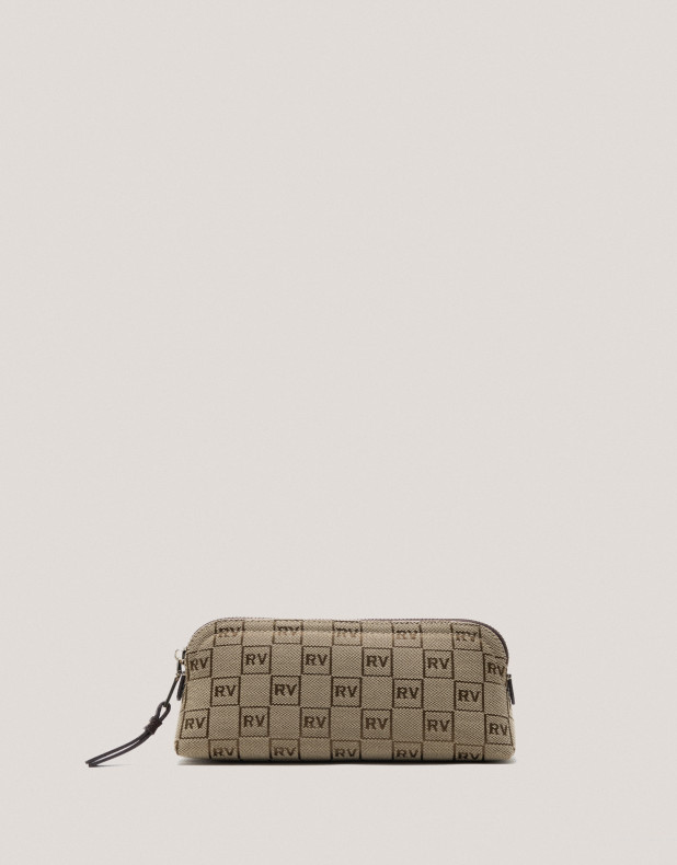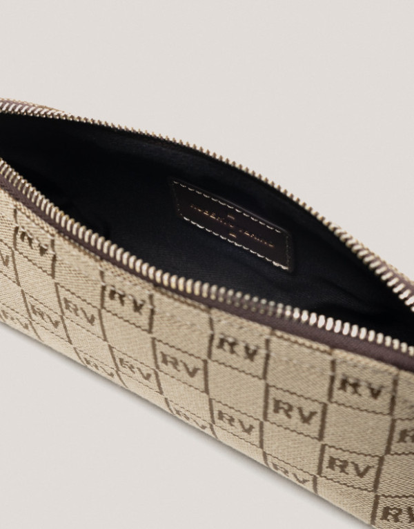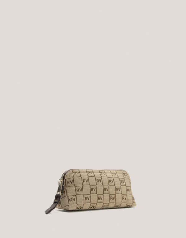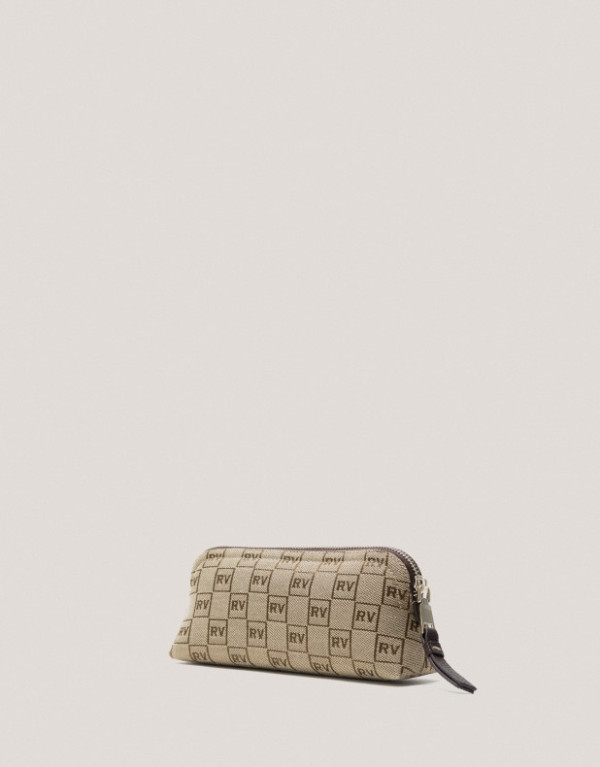Estuche en tejido jacquard personalizado RV en tonalidades marrones. Cierre mediante cremallera con tirador en piel color marrón e interior forrado. Medidas aproximadas: 22 x 9 x 6 cm