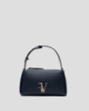 Bolso de mano pequeño en piel color azul marino con logo metálico RV en panel frontal y bolsillo exterior de cremallera en la parte trasera. Cierre con cremallera, interior forrado y compartimentado con un bolsillo de cremallera y otro plano. Asa de hombro extraíble y regulable de 114 a 127 cm. Asa de mano regulable de 28 a 40 cm. Medidas aproximadas: 24 x 13 x 8 cm.