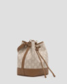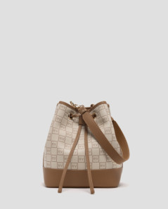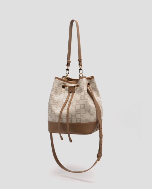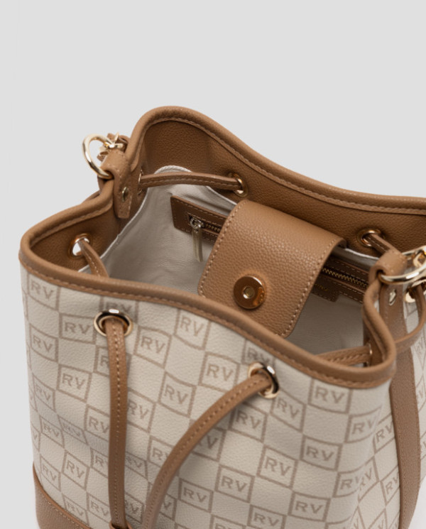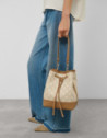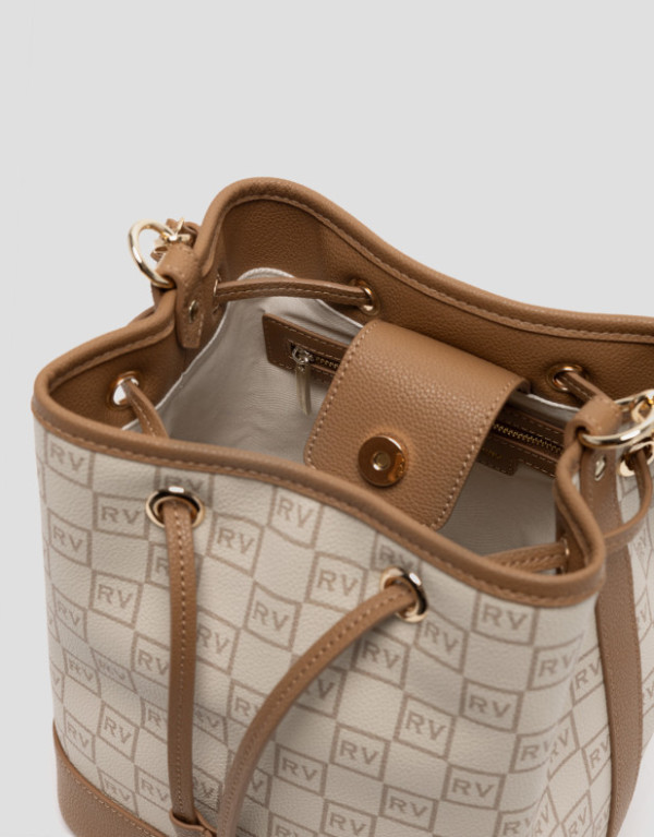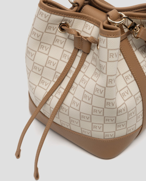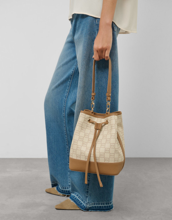 Bolso de mano estilo bucket en piel personalizada con logos en color crema y cámel combinado con piel color cuero en vivos, base y asas. Doble cierre con cordón de piel para ceñir y pestaña con clip metálico en el interior. Interior forrado y compartimentado con bolsillo abierto plano y bolsillo de cremallera. Asa de hombro extraíble con mosquetones de 25 cm de altura y asa bandolera regulable de 112 a 130 cm. Metálicas en oro claro. Medidas aproximadas: 21 x 26 x 17 cm.