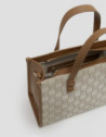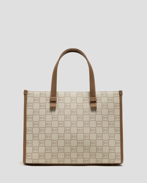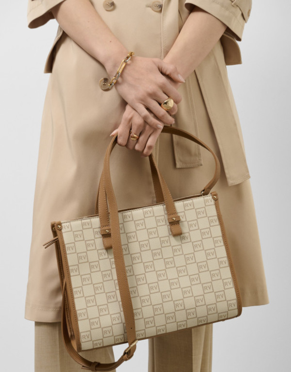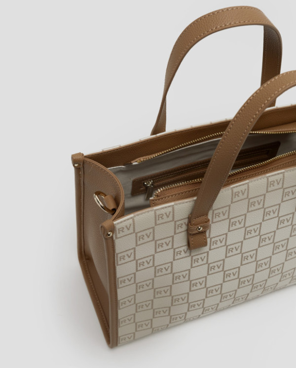 Bolso de mano estilo satchel en piel personalizada con logos en color crema y cámel combinado con piel color cuero en vivos, base y asas. Cierre de cremallera, interior forrado y compartimentado con bolsillo abierto plano y bolsillo de cremallera. Asa de mano de 14 cm de altura y asa bandolera extraíble y regulable de 112 a 130 cm. Metálicas en oro claro. Medidas aproximadas: 32 x 23 x 13 cm.