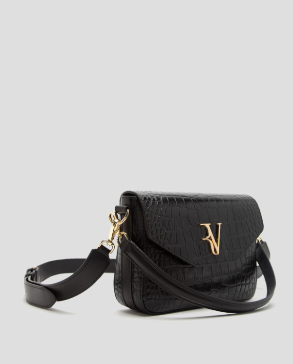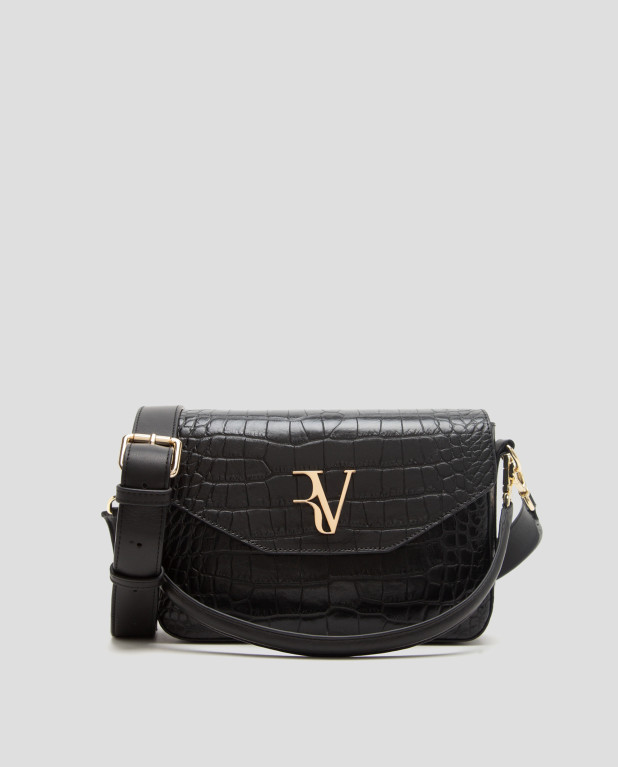 Bolso bandolera en piel grabado coco color negro con solapa personalizada con logo RV y cierre con imán. Interior forrado y compartimentado con bolsillo abierto. Acabados metálicos en color oro claro. Asa bandolera regulable de 129 a 114 cm y asa de hombro de altura 20 cm. Medidas aproximadas: 24 x 18 x 6 cm.