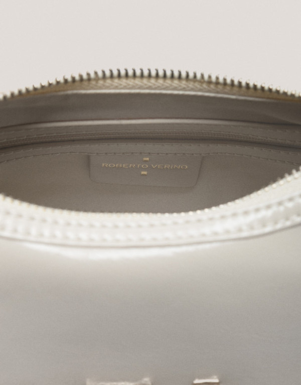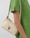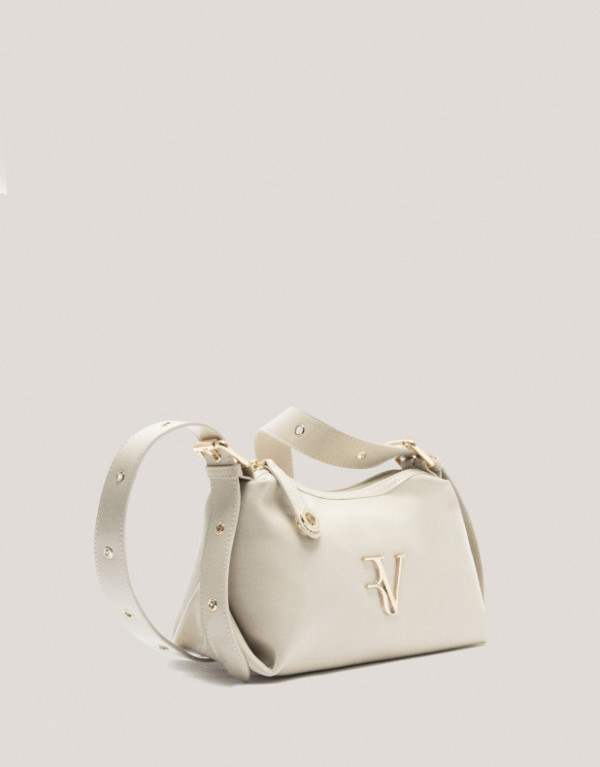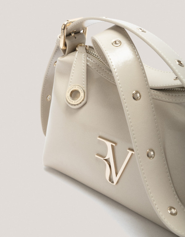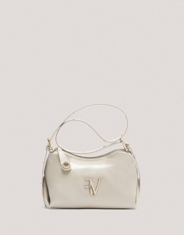 Bolso de hombro en piel craquelada y acharolada color marfil con asa decorada con ojales metálicos y logo metálico RV en panel frontal. Cierre de cremallera, interior forrado y compartimentado con un bolsillo de cremallera y un bolsillo abierto plano. Asa de hombro regulable de 67 cm de largo y altura de 33 cm. Metálicas en oro claro. Medidas aproximadas: 24 x 15 x 13 cm.