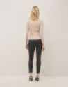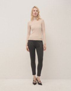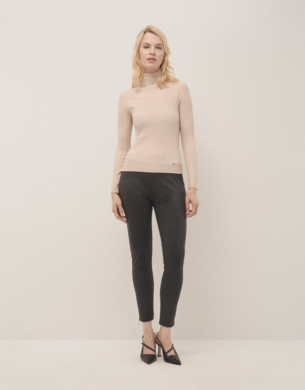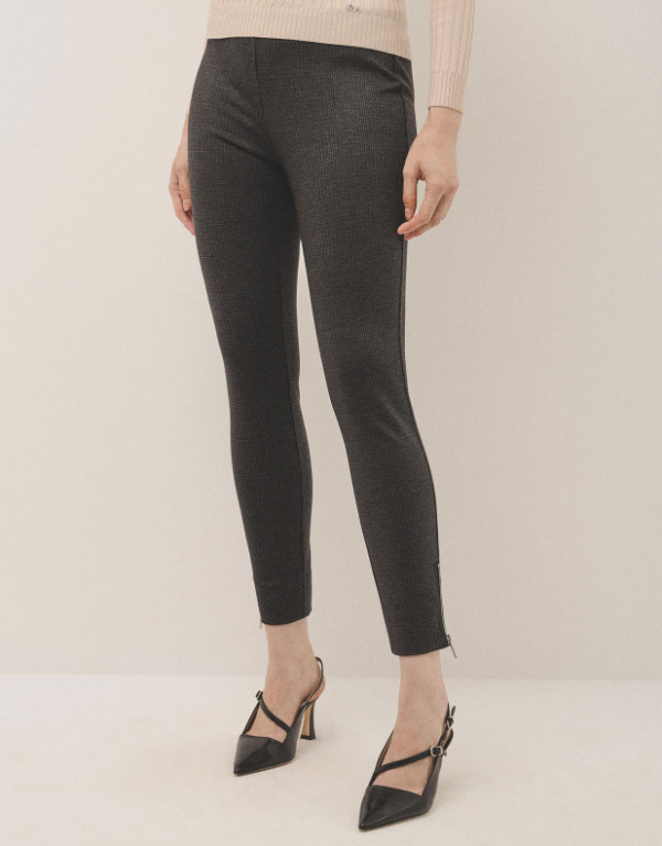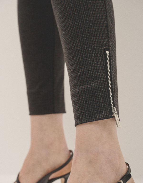 Pantalón legging en un punto elástico cortado y cosido con diseño de pata de gallo en tonos marrones. Bajo con cremalleras.
