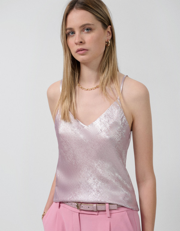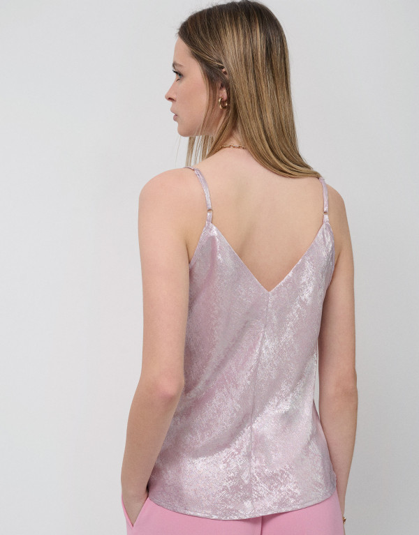 Top de sisas en un tejido laminado con brillo en color rosa. Escote pico en delantero y espalda y sisas ajustables.