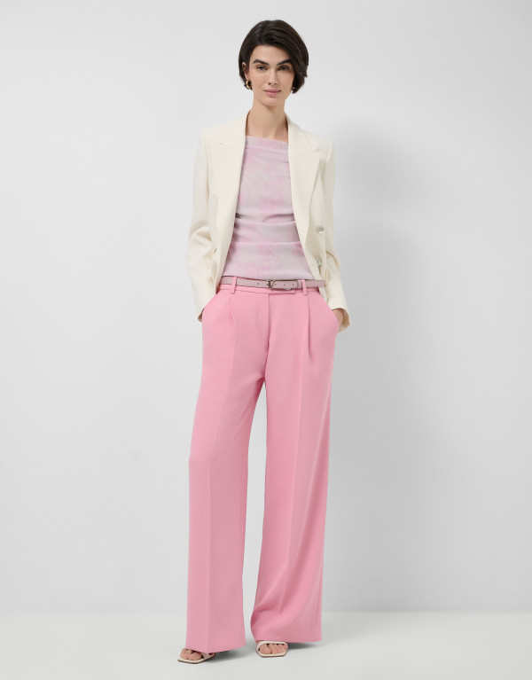 Camiseta de manga corta en tul color rosa con doble tejido en delantero y espalda. Escote redondo y frunces en hombro y cintura.