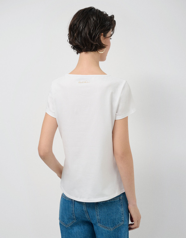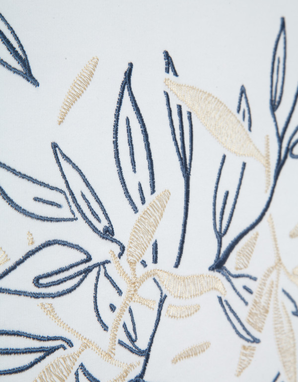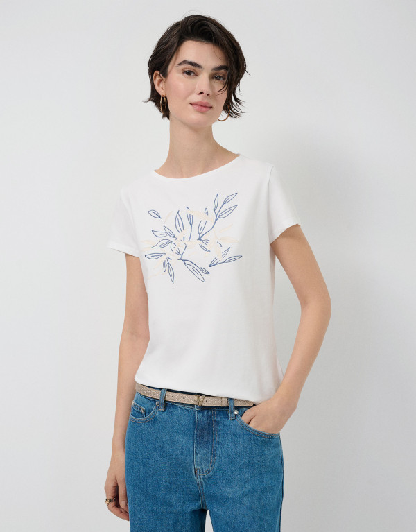 Camiseta de manga corta en un algodón ligeramente elástico color blanco con bordado vegetal en tonos azules y beige en delantero. Cuello barco y corte recto.