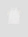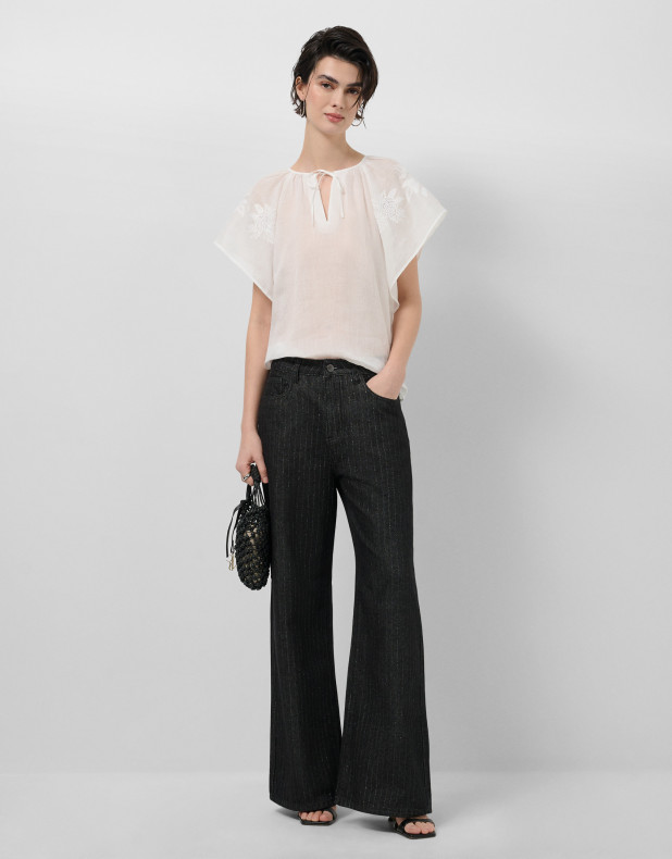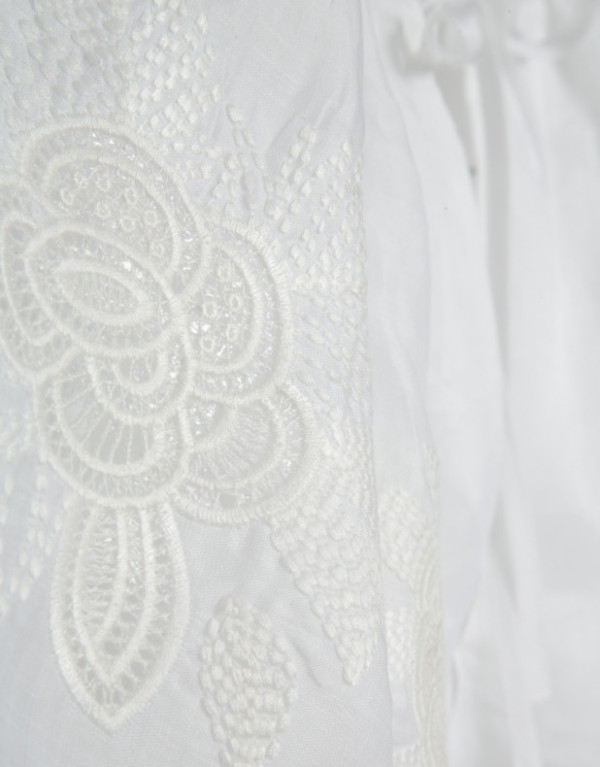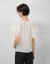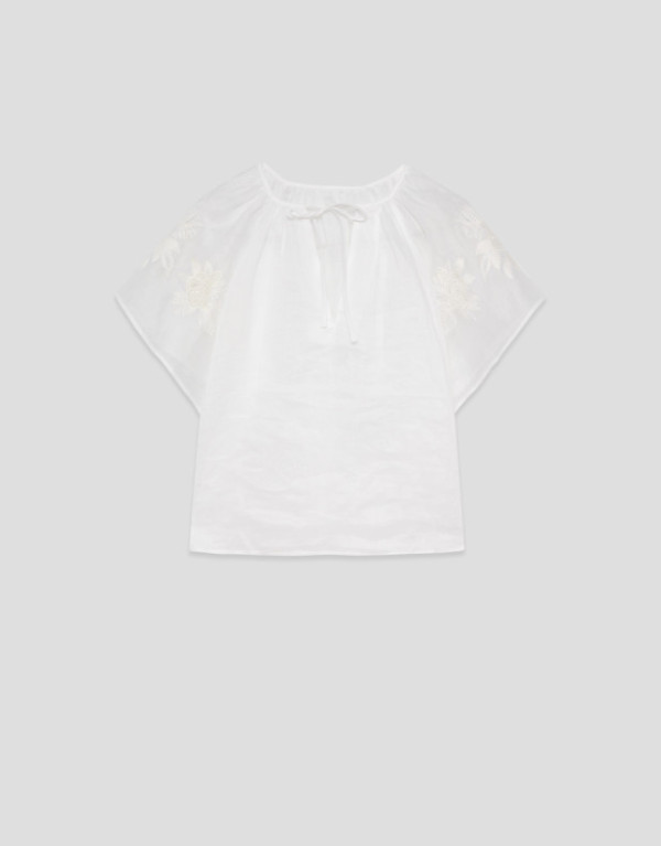 Blusa de manga volante en un tejido de ramio color blanco con bordado floral a tono en mangas. Escote amplio fruncido y ceñido con cordón.