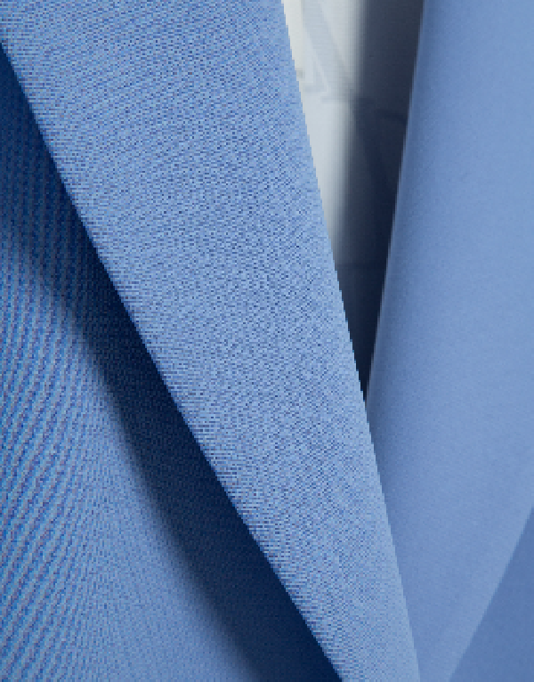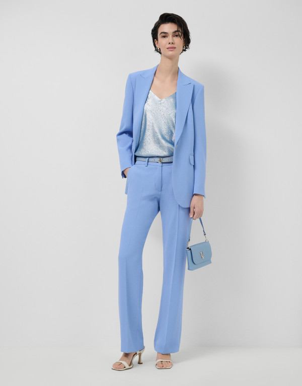 Blazer en un crepé color azul claro con cierre de un botón y forro en el interior. Cuello solapa, manga larga rematada con botones y bolsillos con tapeta en delantero.