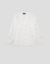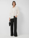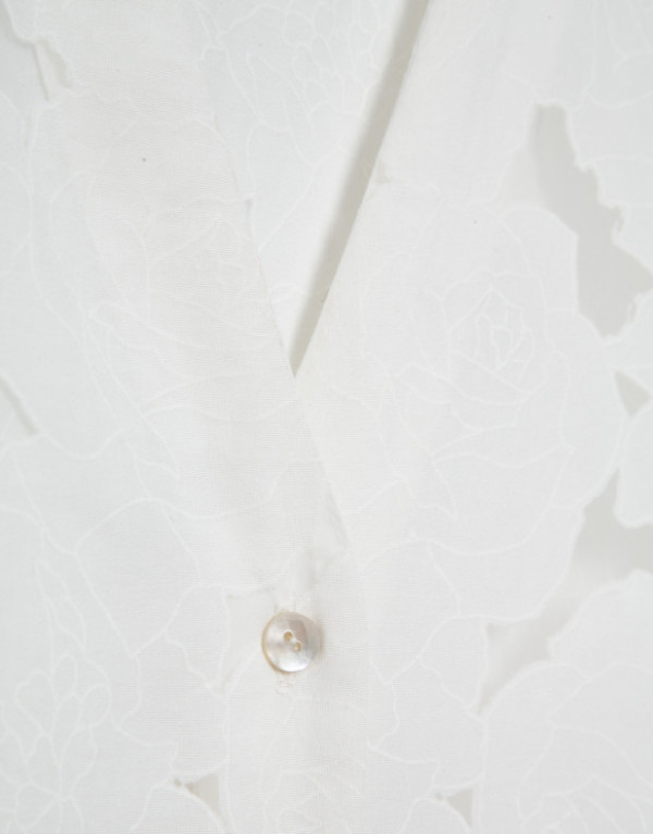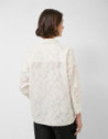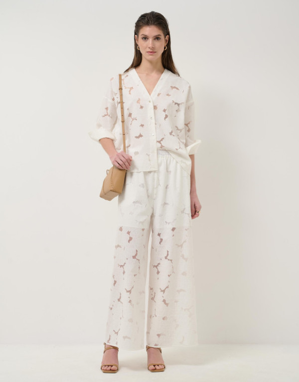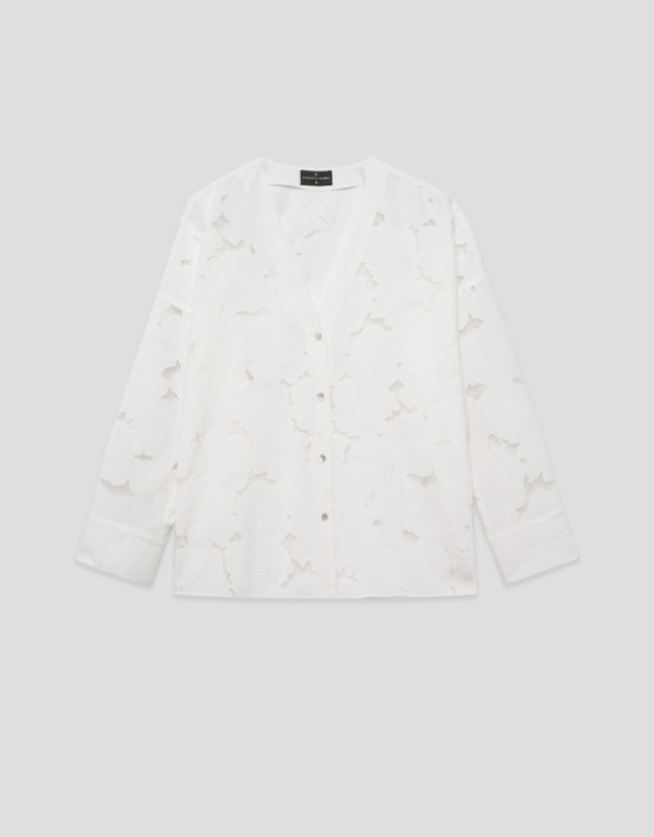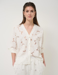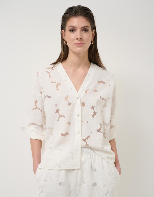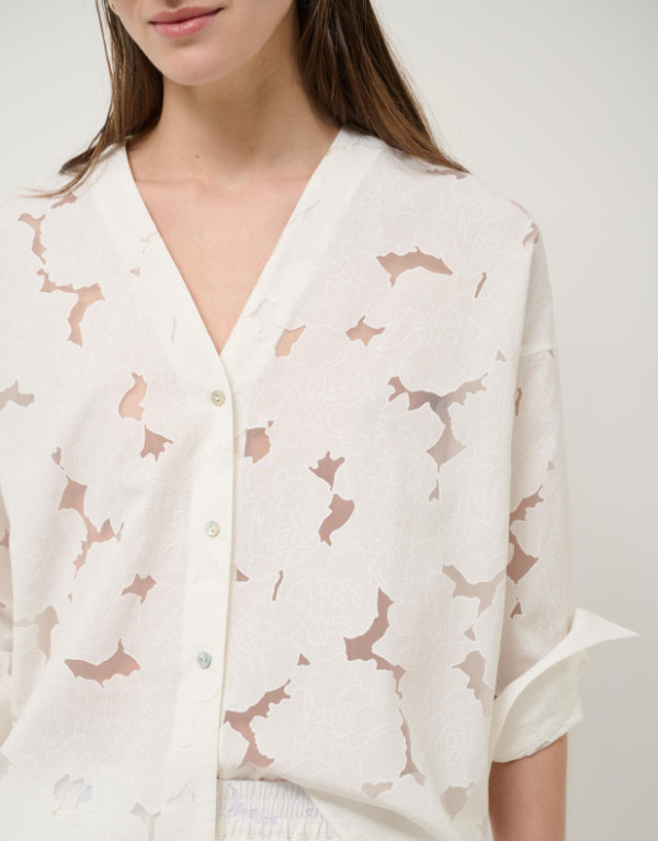 Blusa de corte ovesize en un tejido devoré color blanco con estampado floral a tono. Escote pico, sisa cuadrada, manga caída rematada con puño y sardineta y cierre con botonadura vista en frontal.