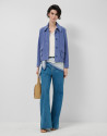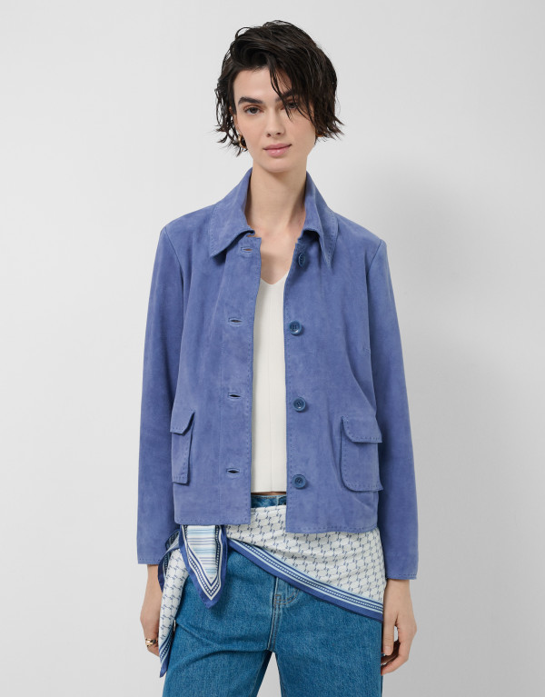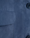 Chaqueta en ante color azul con pespuntes a tono y forro con jacquard personalizado en el interior. Cuello camisero, dos bolsillos de tapeta y cierre con cuatro botones en delantero.