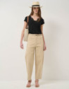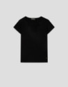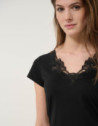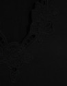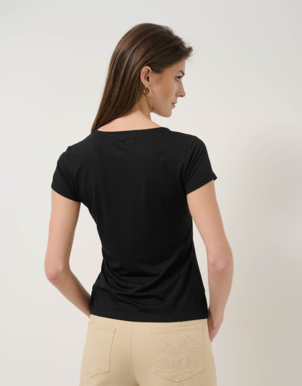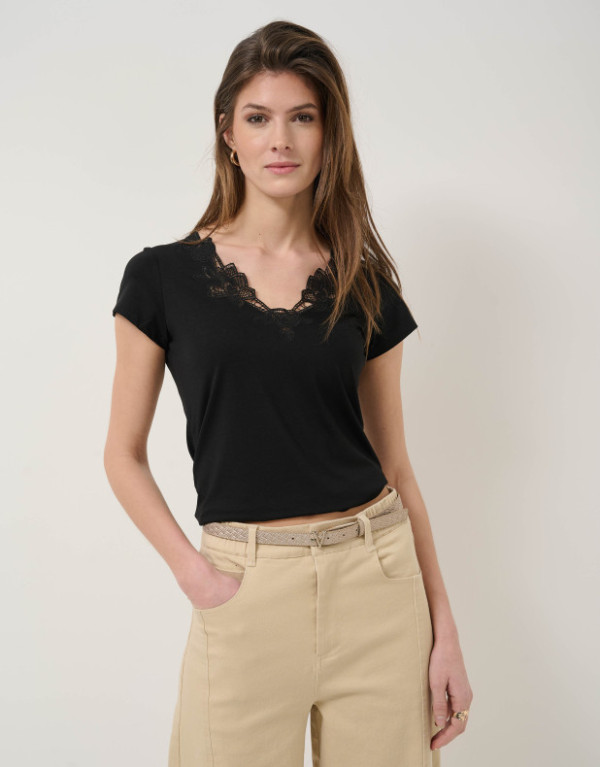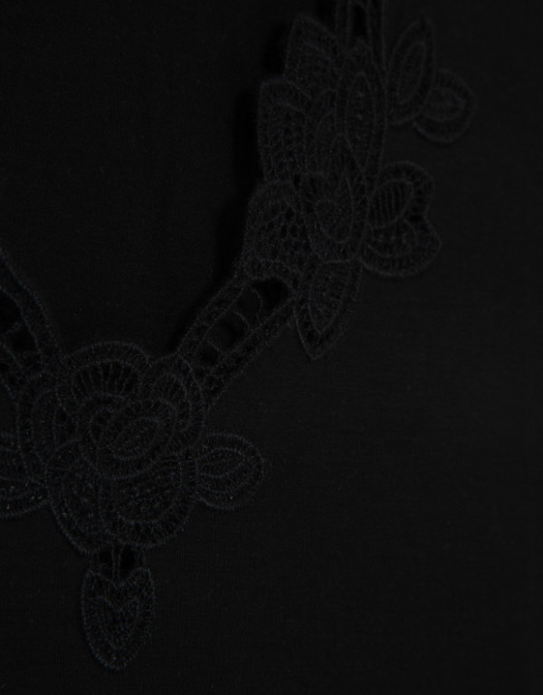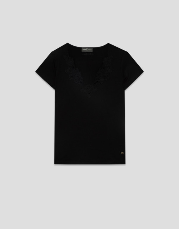 Camiseta de manga corta en un tejido de algodón ligeramente elástico color negro. Escote pico con guipur calado y bordado floral a tono.