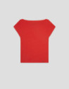 Camiseta en un tejido fluido ligeramente elástico de corte entallado color rojo. Escote drapeado, cuerpo ajustado y chapa RV en bajo delantero.
