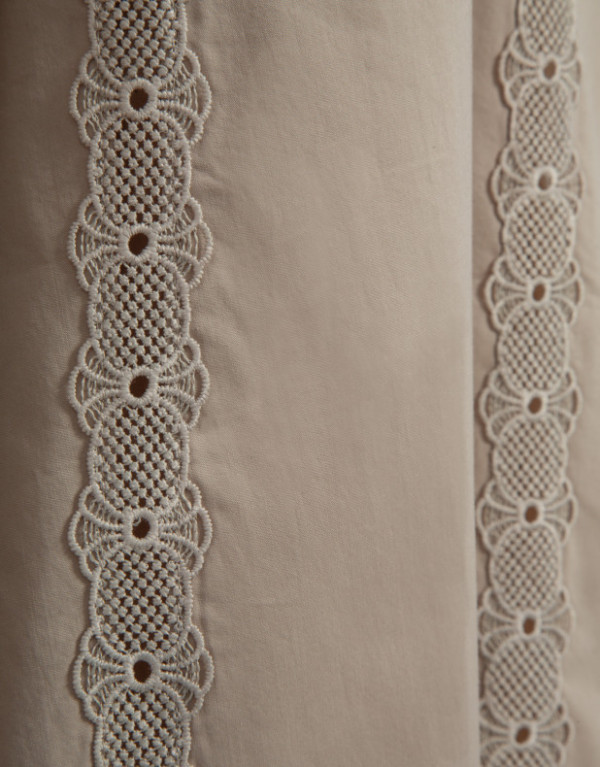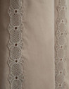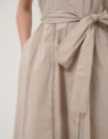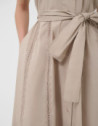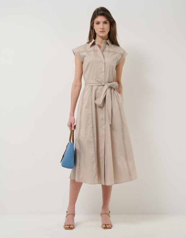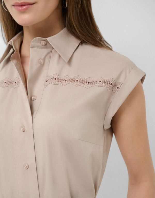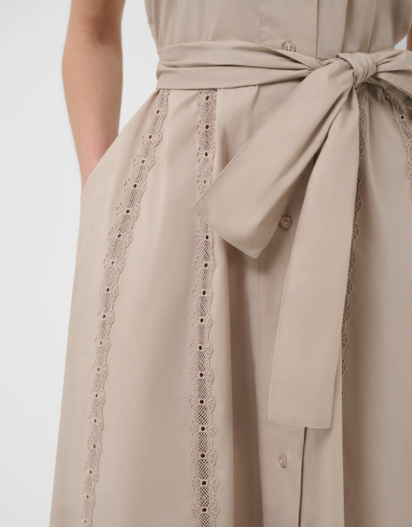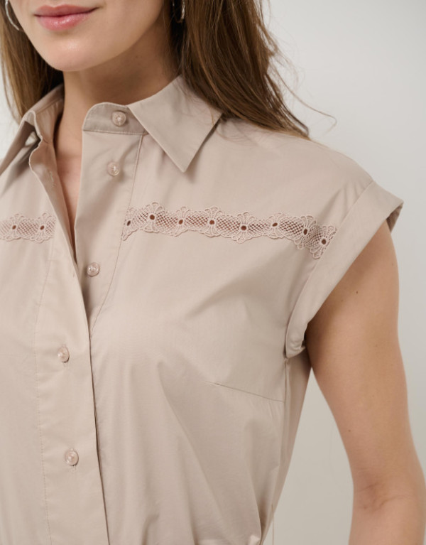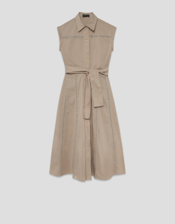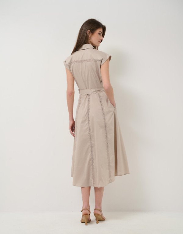 Vestido midi camisero sin mangas en un tejido mezcla algodón color camel con aplicación horizontal de tira de encaje decorativa a tono en pecho y varias tiras verticales en falda. Cuello camisero, dos bolsillos laterales y cierre con botonadura vista en centro delantero y con cinturón de atar en el mismo tejido.