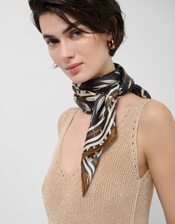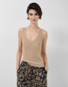 Top de sisas en un punto grueso con lúrex color cámel, combinado con punto calado en contornos. Escote pico en delantero y espalda.