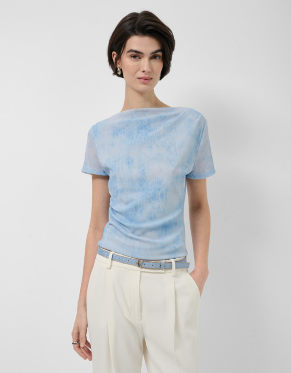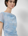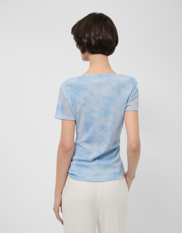 Camiseta de manga corta en tul color azul claro con doble tejido en delantero y espalda. Escote redondo y frunces en hombro y cintura.