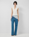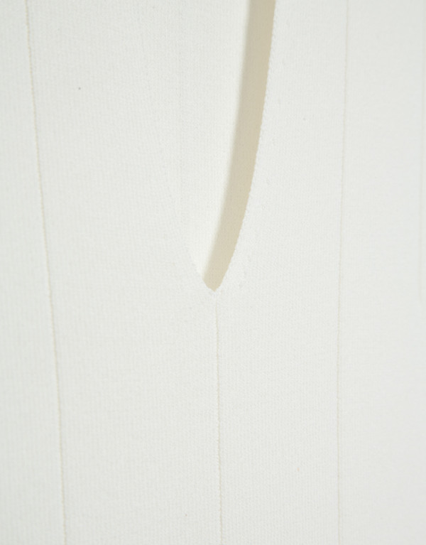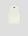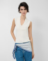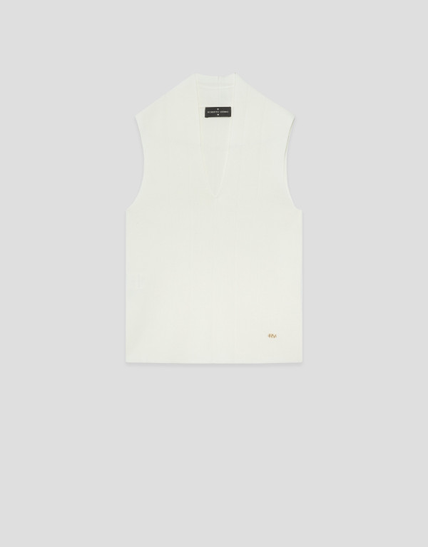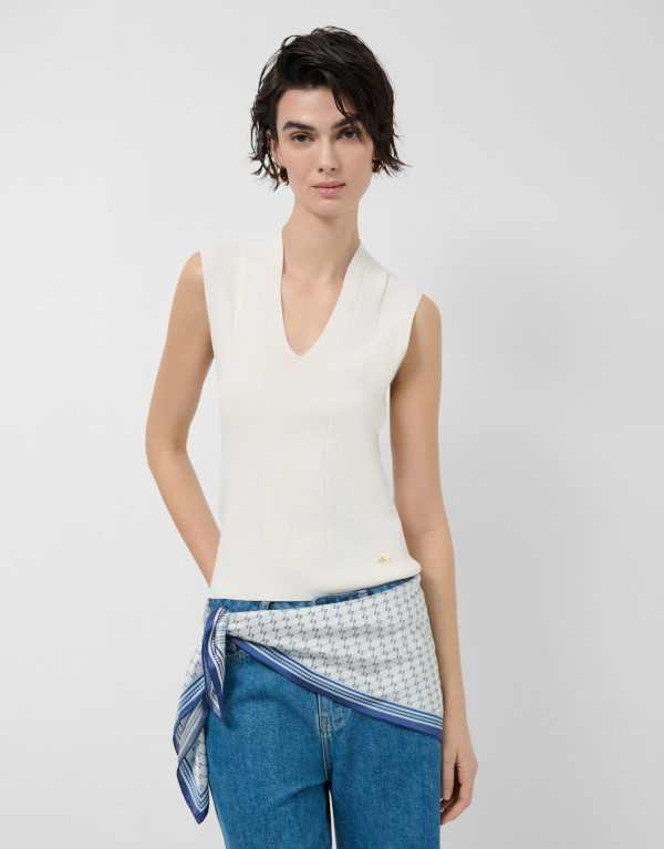 Top sin mangas y escote en V profundo en un punto roma color crudo con líneas verticales decorativas en centro delantero y hombros.