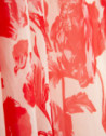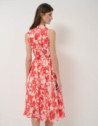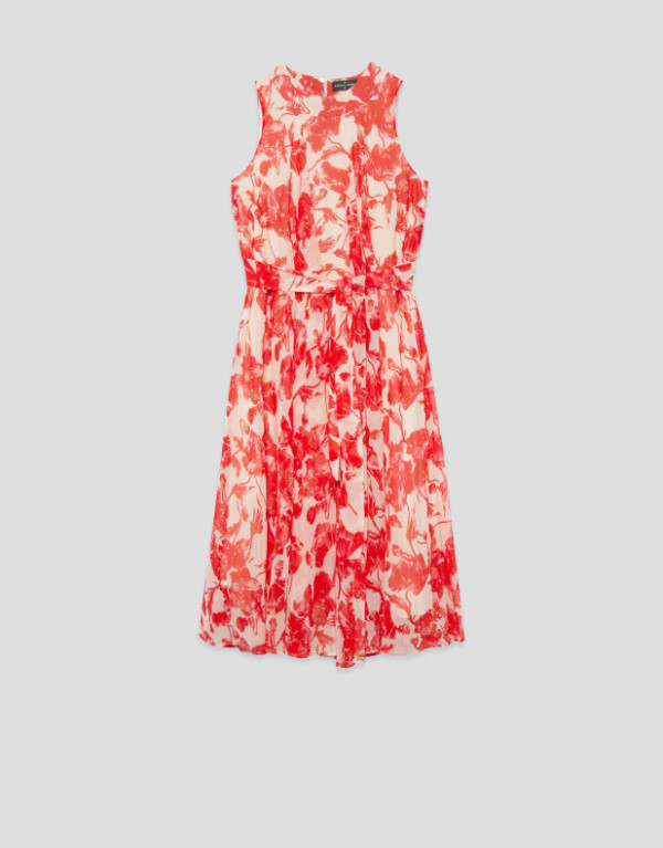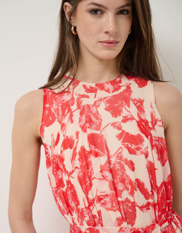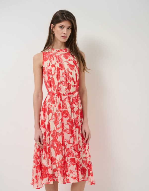 Vestido sin mangas en un tejido ligero de base beige con estampado floral rojo y forro en el interior. Escote redondo, falda con vuelo, bolsillos en laterales y cierre con botones en centro espalda y con cinturón de atar en el mismo tejido.